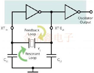 利用具有較低增益裕度[GM]的振蕩器設計的高級IoT芯片組需要具有低等效串聯電阻[ESR]和低電鍍電容[C0]的晶體,以確保在較寬的溫度范圍和較低的電池功率水平下快速啟動.許多芯片組[MCU,FPGA和SOC]的RF功能或時序模塊使用片上Pierce振蕩器配置來生成參考時鐘頻率.通常,該模塊是一個反相器放大器,該驅動器通過添加一個外部石英晶體諧振器[Y1]和兩個負載電容器[CL1,CL2]來驅動諧振回路,如圖1所示.可以包括一個附加的反饋電阻以幫助穩定直流工作點. 使用芯片組制造商提供的反相放大器的跨導值,可以計算出由放大器反饋環路和晶振諧振環路完成的參考時鐘的增益裕度GM.參見圖1.為在所有環境條件下保證晶體諧振電路的正常工作,增益裕度GM[或安全系數]至少應大于3.0,目標目標應大于5.0.