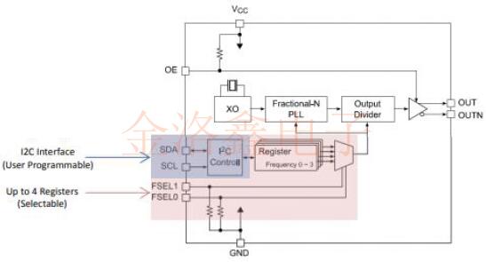 該石英晶體振蕩器系列由SPXO,小數(shù)N分頻PLL,LVPECL輸出緩沖器和輸出使能組成.可選選項最多具有4個其他寄存器,這些寄存器是預(yù)編程的或用戶可編程的,用戶可以從中選擇.用戶可編程選件具有I2C控制塊,可根據(jù)需要對頻率進(jìn)行重新編程.