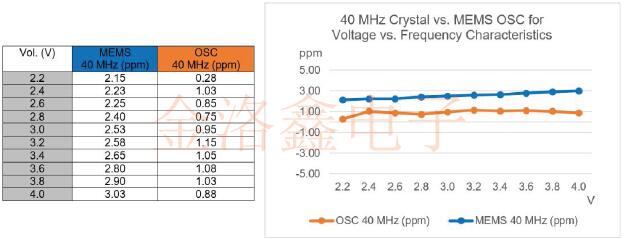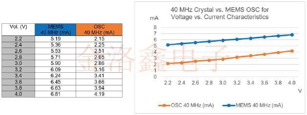 圖2:40MHzMEMS和石英振蕩器的功耗測量.