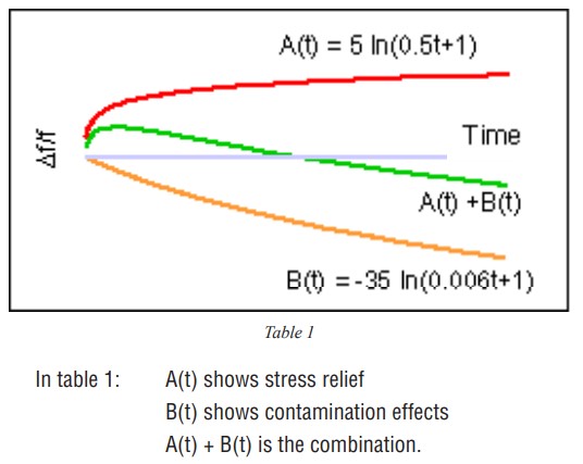 當(dāng)施加應(yīng)力時(shí),石英晶體會(huì)改變頻率。這種壓力可以來自于任何一種或所有的幾種來源。封裝和安裝,環(huán)氧樹脂連接,金屬薄膜,和石英本身可以是應(yīng)力的來源。如果應(yīng)力在該部件的使用壽命中是恒定的,則頻率將保持不變。然而,在現(xiàn)實(shí)世界中,壓力會(huì)隨著時(shí)間的推移而放松,因此,壓力相關(guān)的就會(huì)老化。